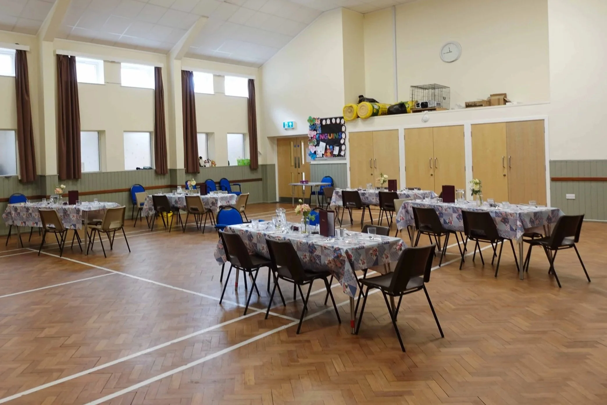 It has capacity for 90 people, and adjoining kitchen with a service hatch. There are plenty of tables and chairs (including children’s chairs) to use, and plenty of height if you are thinking of hiring a bouncy castle!